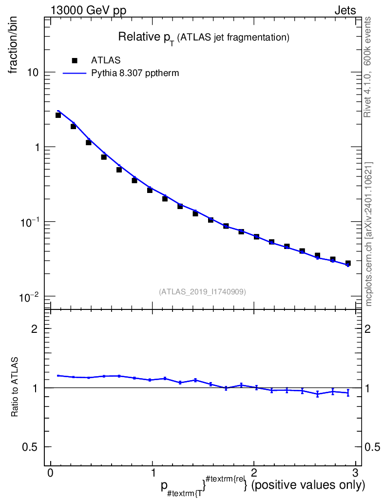 Lines: data, pythia8 8.307 pptherm |