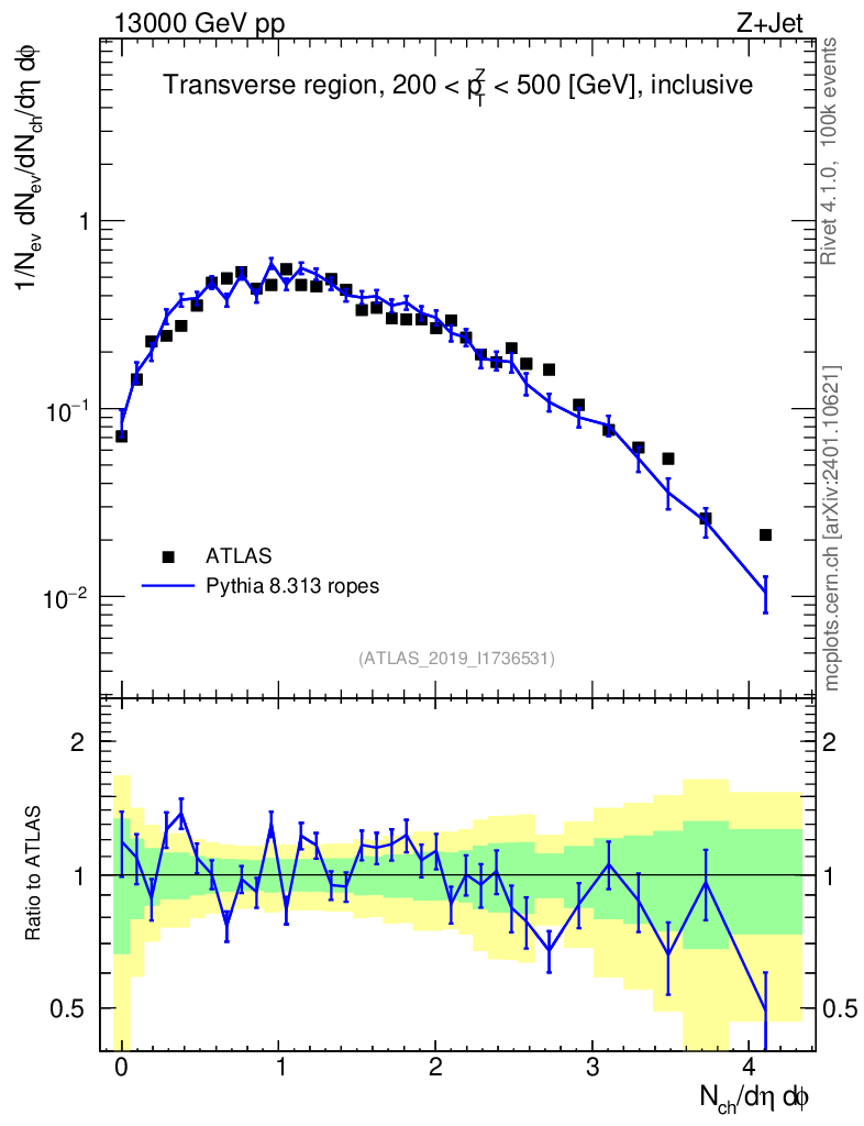 Lines: data, pythia8 8.313 ropes |