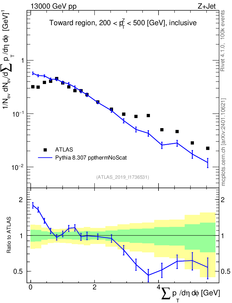 Lines: data, pythia8 8.307 ppthermNoScat |