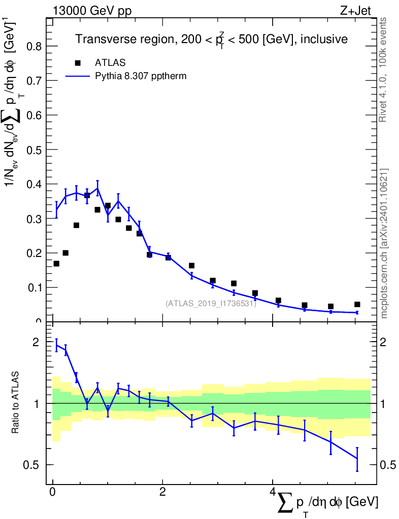 Lines: data, pythia8 8.307 pptherm |