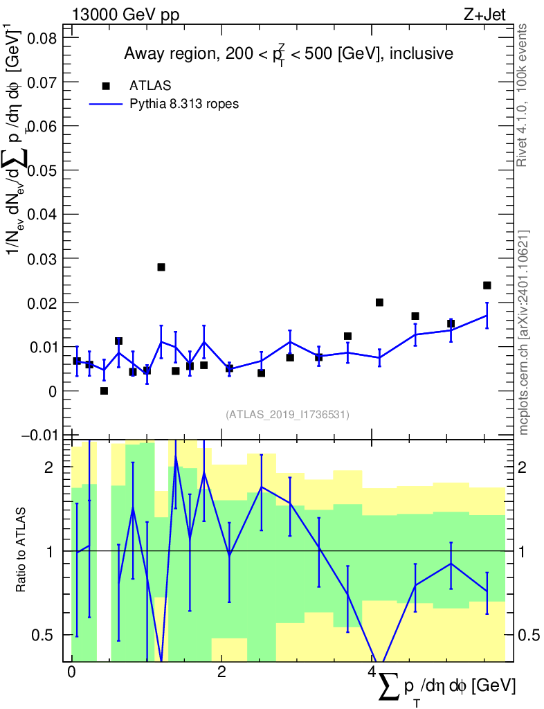 Lines: data, pythia8 8.313 ropes |