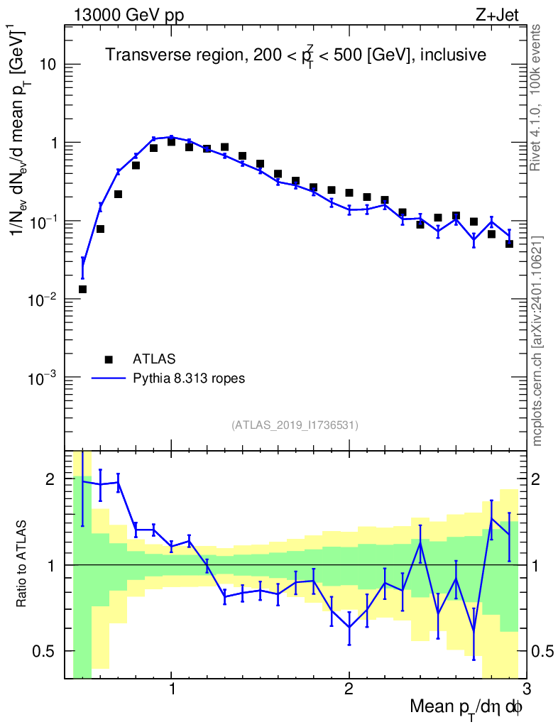 Lines: data, pythia8 8.313 ropes |