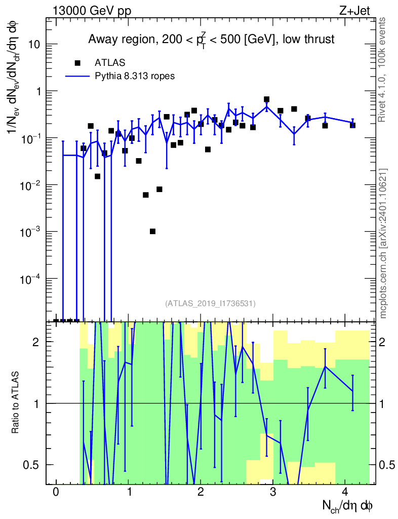 Lines: data, pythia8 8.313 ropes |