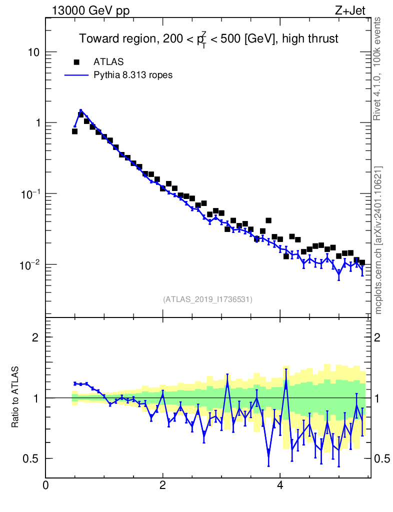 Lines: data, pythia8 8.313 ropes |