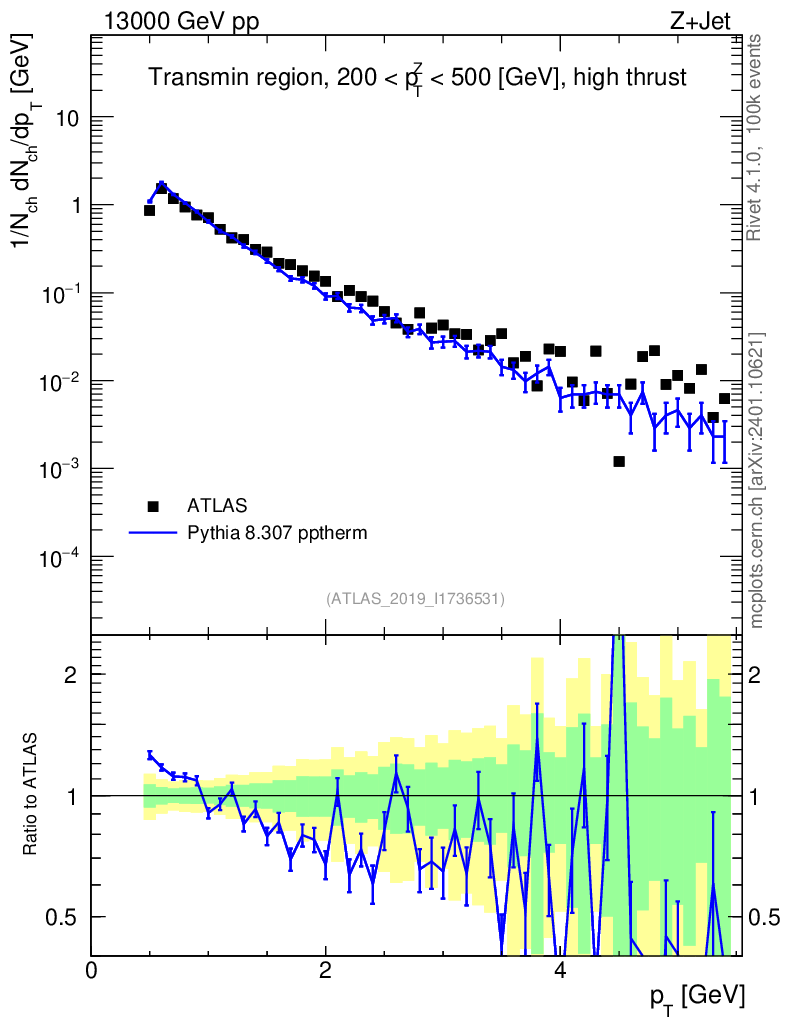 Lines: data, pythia8 8.307 pptherm |