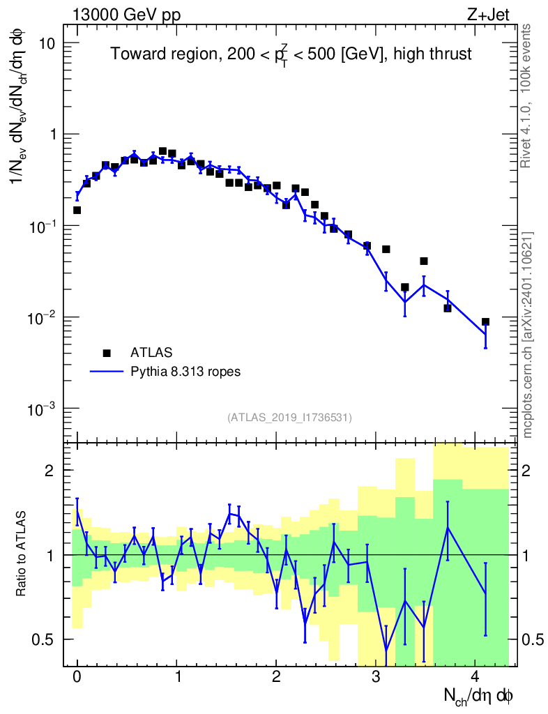 Lines: data, pythia8 8.313 ropes |
