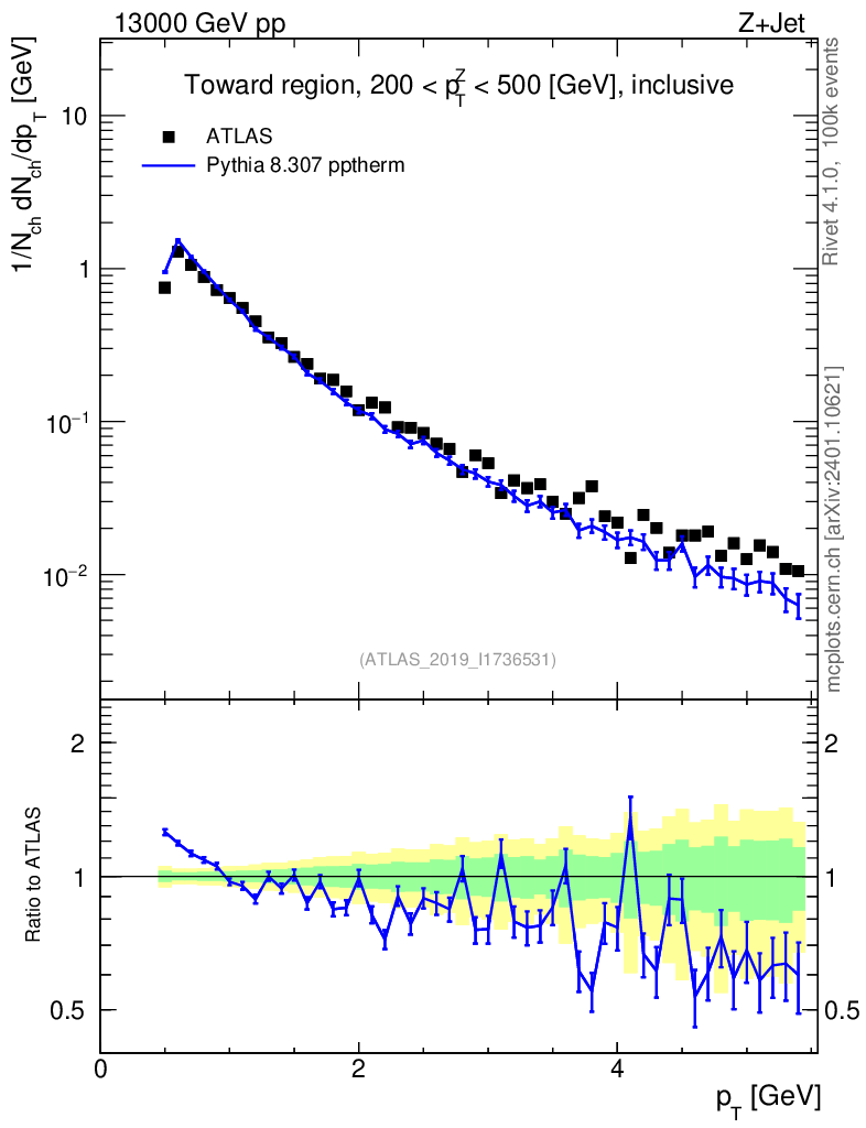 Lines: data, pythia8 8.307 pptherm |