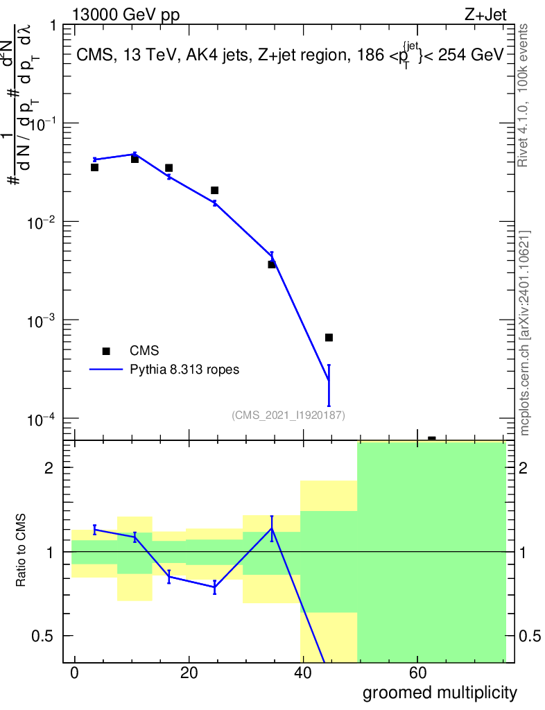 Lines: data, pythia8 8.313 ropes |