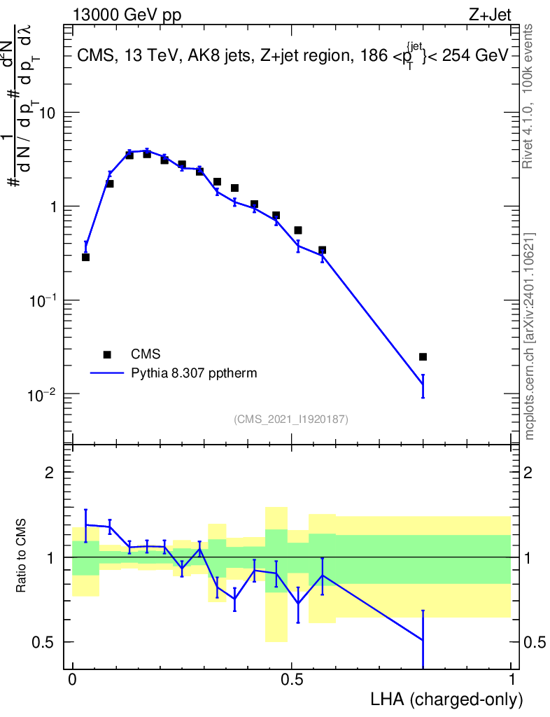 Lines: data, pythia8 8.307 pptherm |