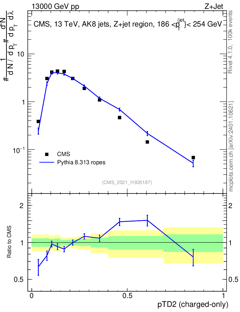 Lines: data, pythia8 8.313 ropes |