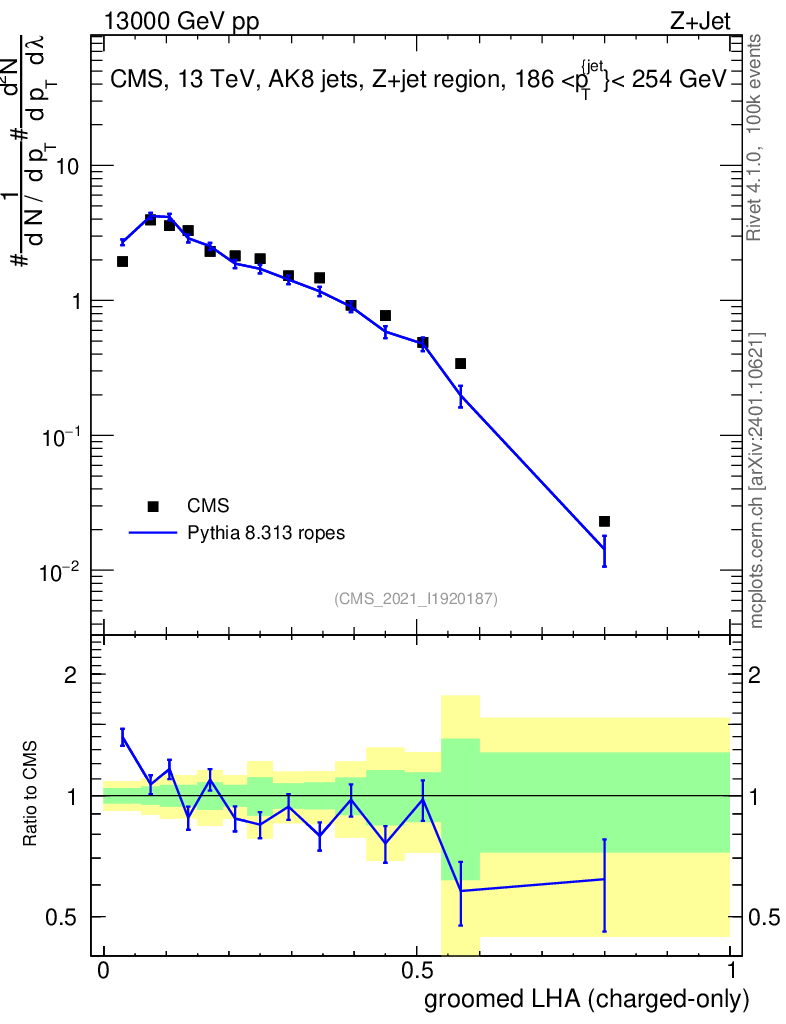 Lines: data, pythia8 8.313 ropes |