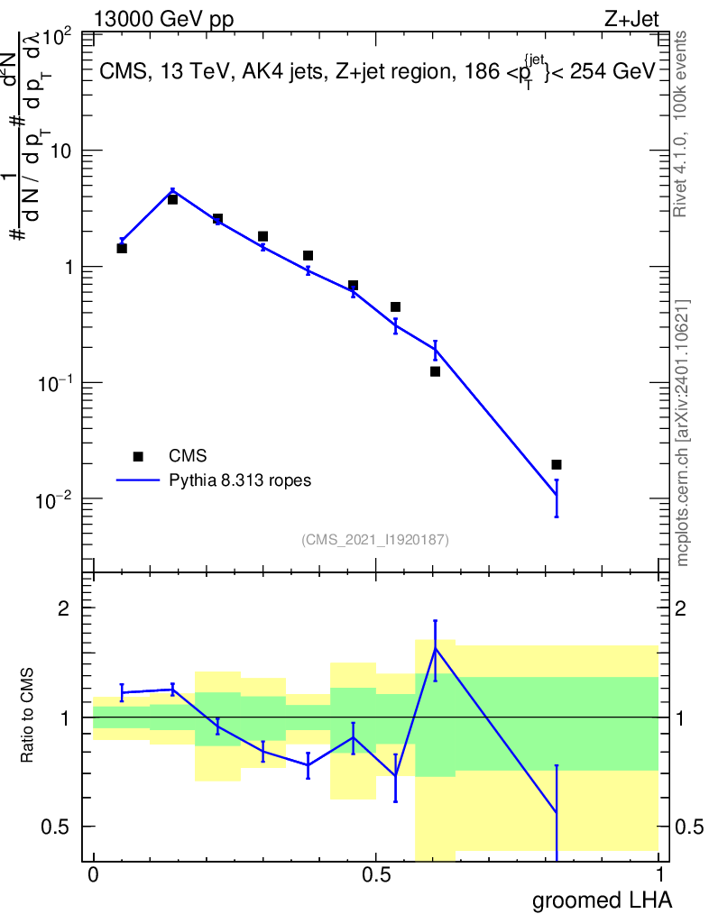 Lines: data, pythia8 8.313 ropes |