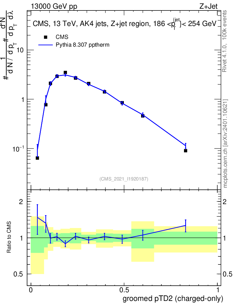 Lines: data, pythia8 8.307 pptherm |