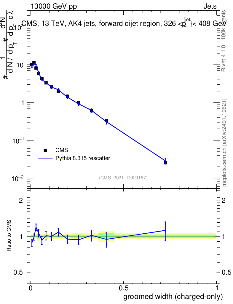 Lines: data, pythia8 8.315 rescatter |