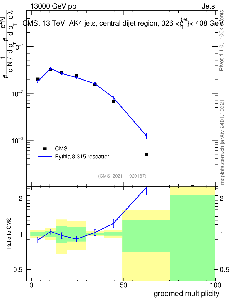 Lines: data, pythia8 8.315 rescatter |