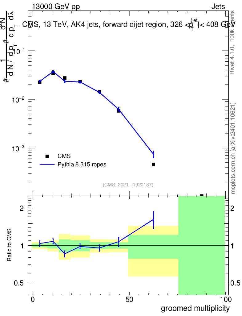 Lines: data, pythia8 8.315 ropes |