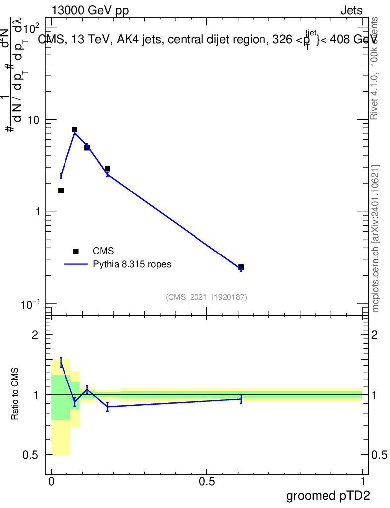 Lines: data, pythia8 8.315 ropes |
