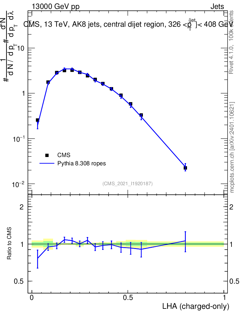 Lines: data, pythia8 8.308 ropes |