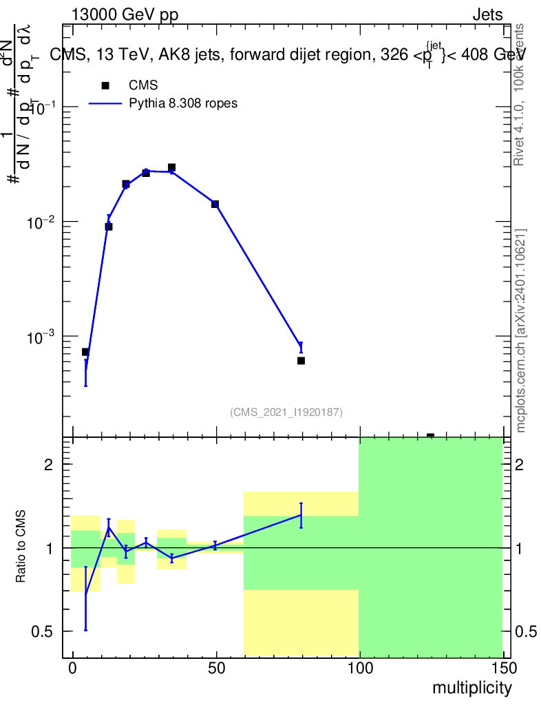 Lines: data, pythia8 8.308 ropes |
