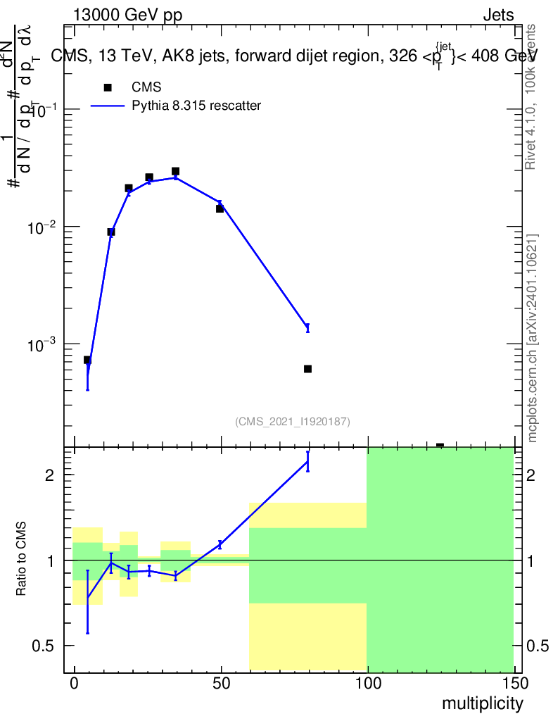 Lines: data, pythia8 8.315 rescatter |