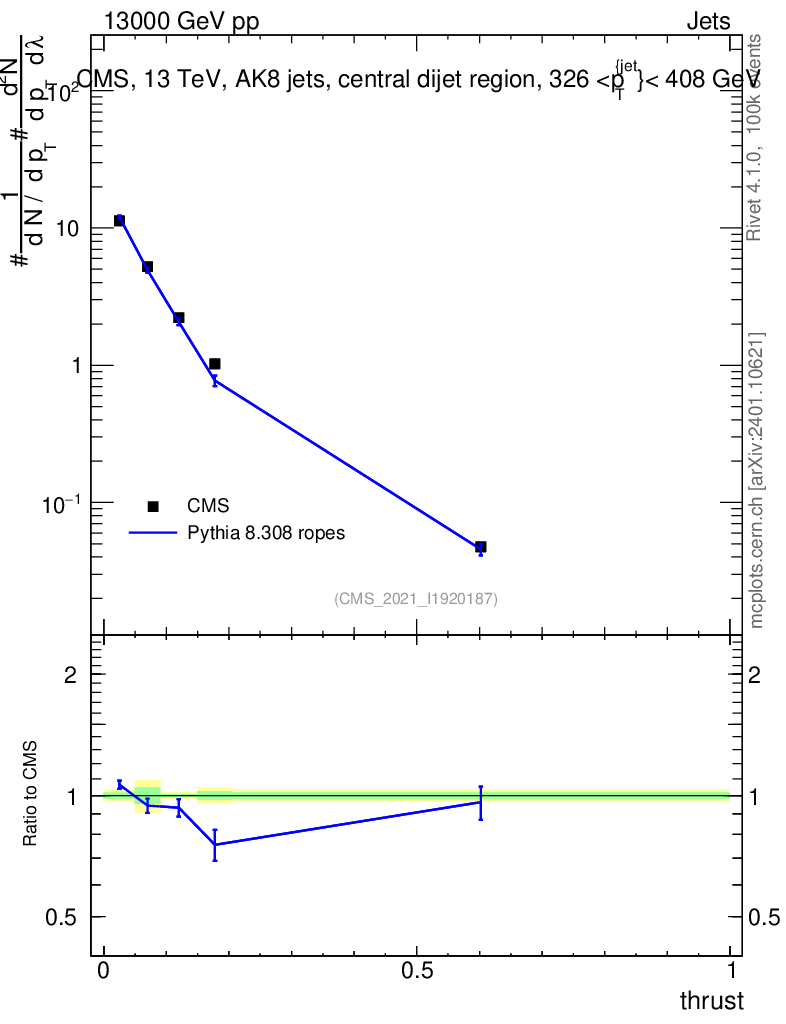 Lines: data, pythia8 8.308 ropes |