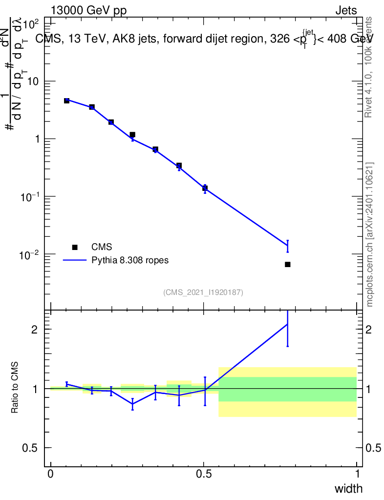 Lines: data, pythia8 8.308 ropes |