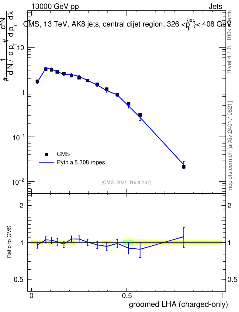 Lines: data, pythia8 8.308 ropes |