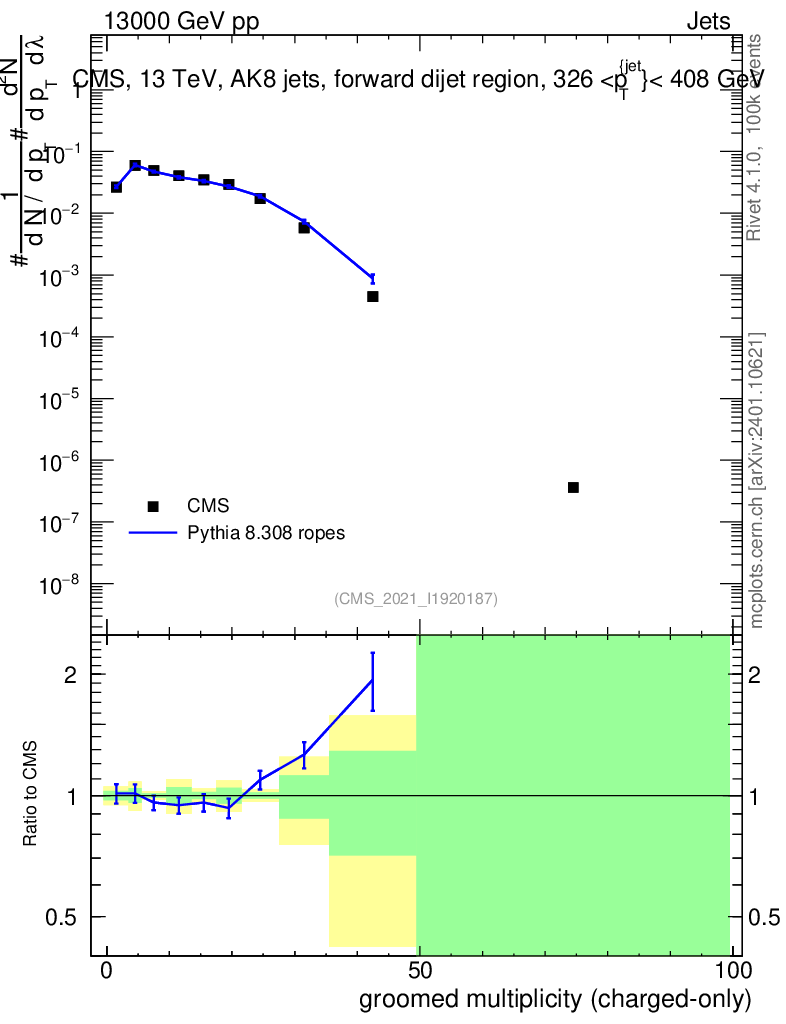 Lines: data, pythia8 8.308 ropes |