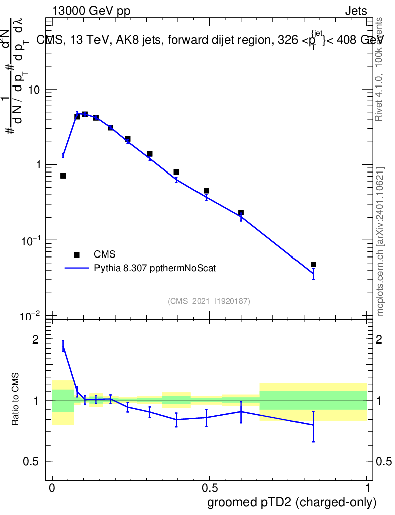 Lines: data, pythia8 8.307 ppthermNoScat |