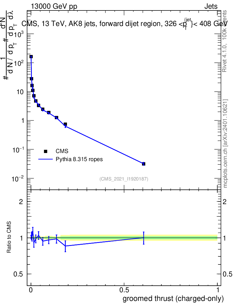Lines: data, pythia8 8.315 ropes |