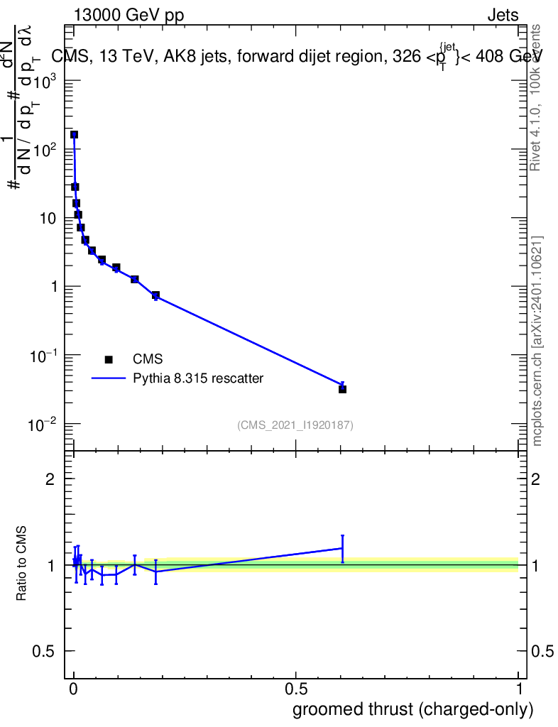 Lines: data, pythia8 8.315 rescatter |