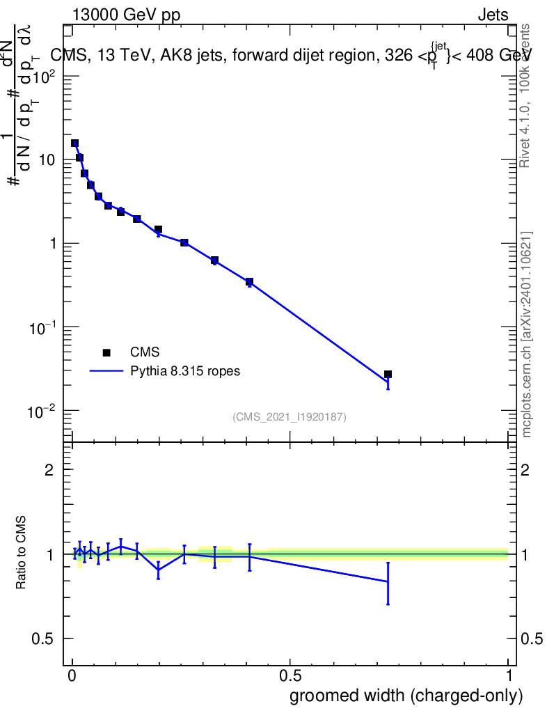 Lines: data, pythia8 8.315 ropes |