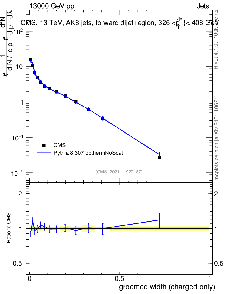 Lines: data, pythia8 8.307 ppthermNoScat |