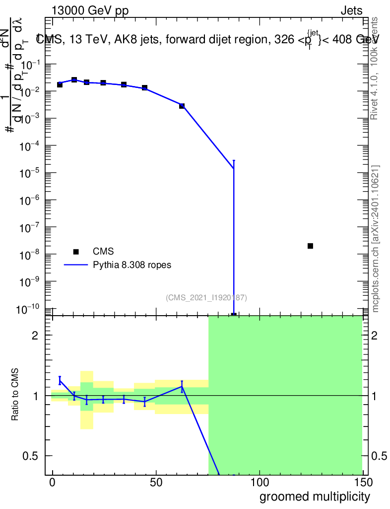 Lines: data, pythia8 8.308 ropes |