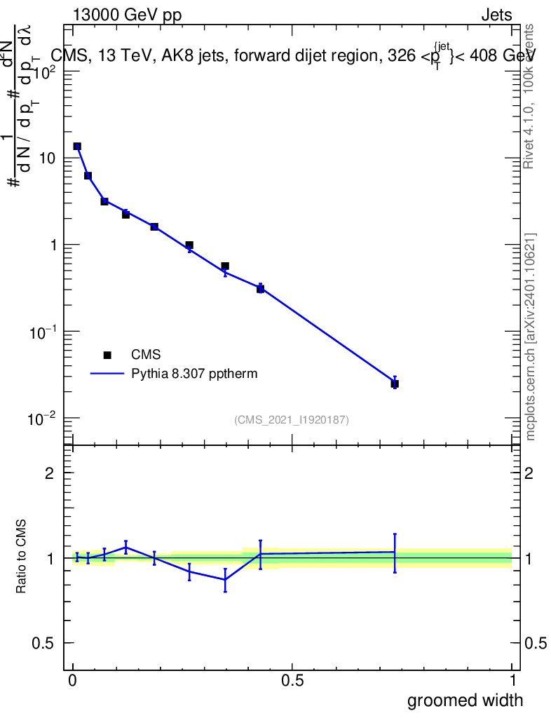 Lines: data, pythia8 8.307 pptherm |