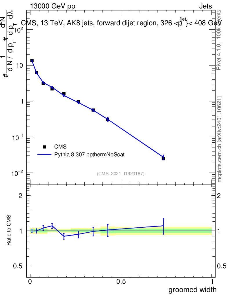 Lines: data, pythia8 8.307 ppthermNoScat |
