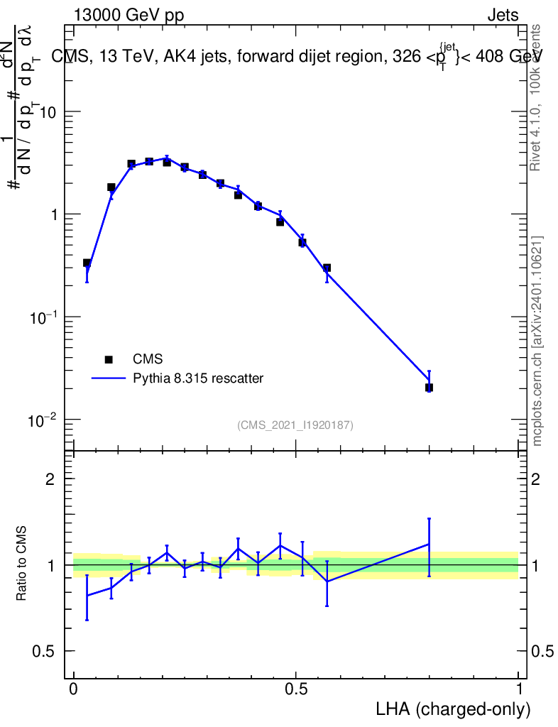 Lines: data, pythia8 8.315 rescatter |