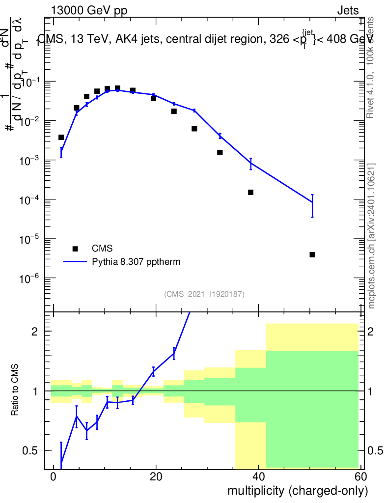 Lines: data, pythia8 8.307 pptherm |