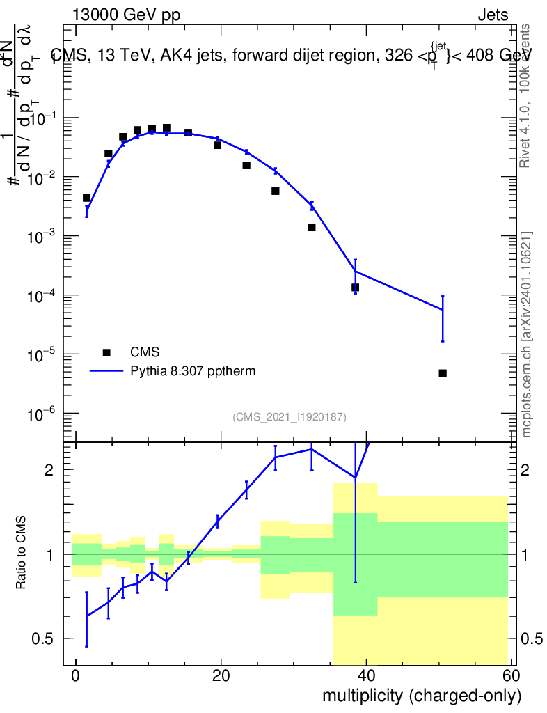 Lines: data, pythia8 8.307 pptherm |