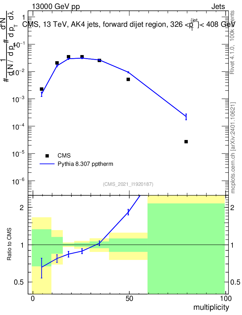 Lines: data, pythia8 8.307 pptherm |