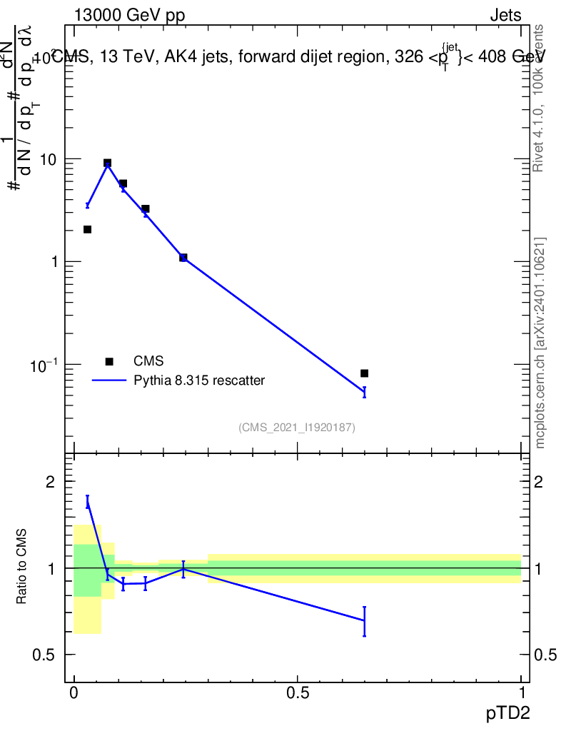 Lines: data, pythia8 8.315 rescatter |