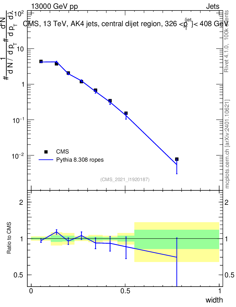 Lines: data, pythia8 8.308 ropes |