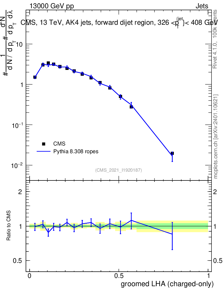Lines: data, pythia8 8.308 ropes |