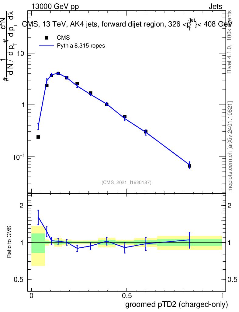 Lines: data, pythia8 8.315 ropes |