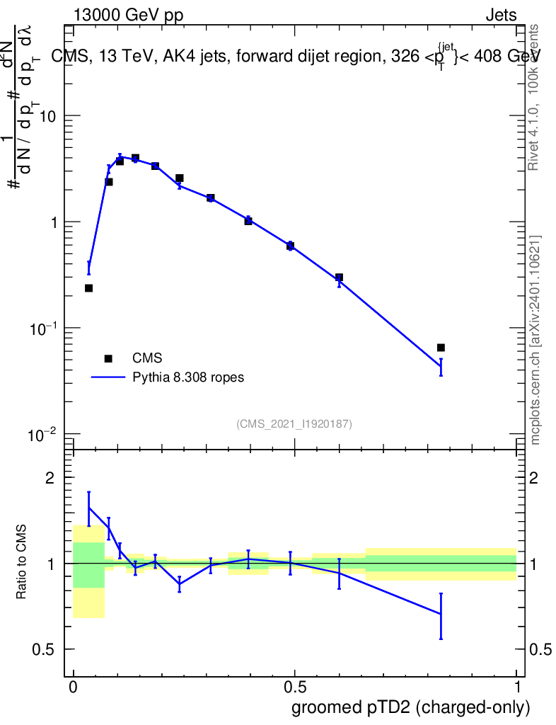 Lines: data, pythia8 8.308 ropes |