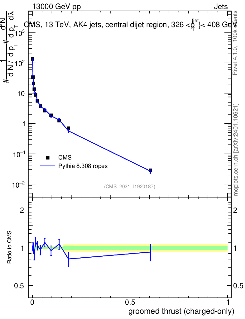 Lines: data, pythia8 8.308 ropes |