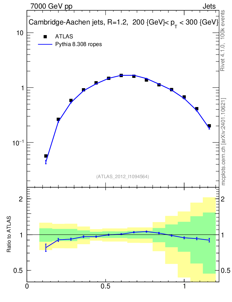 Lines: data, pythia8 8.308 ropes |