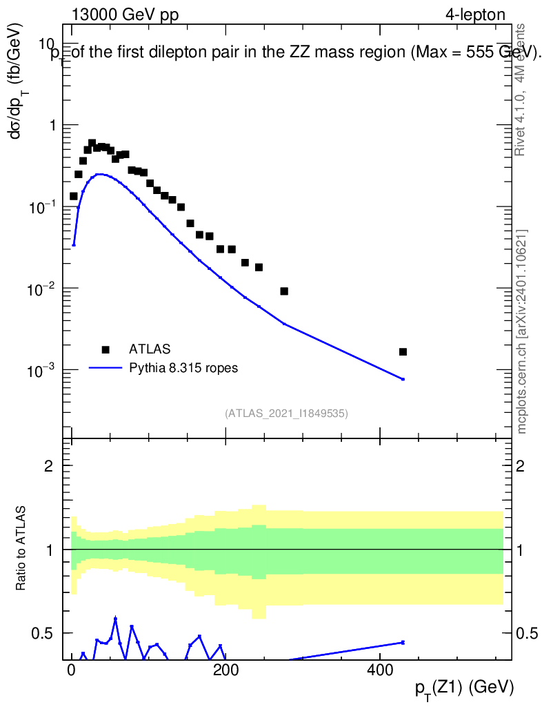 Lines: data, pythia8 8.315 ropes |