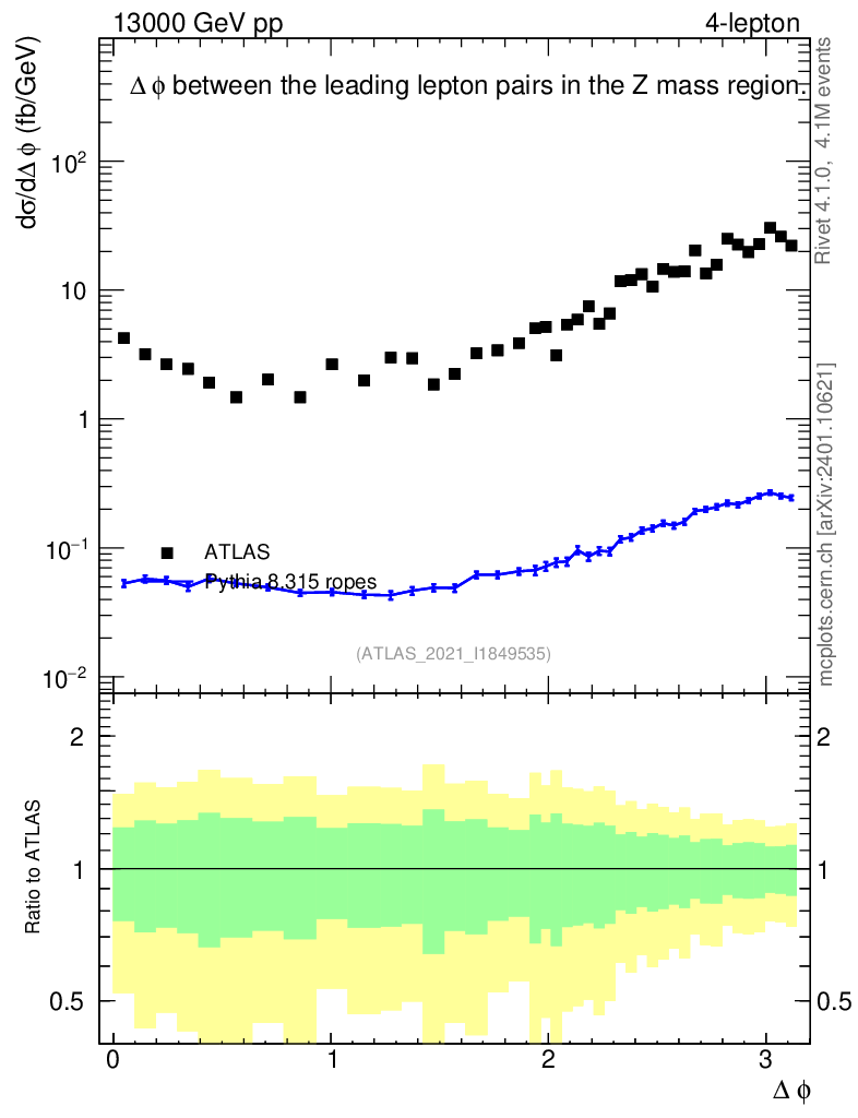 Lines: data, pythia8 8.315 ropes |
