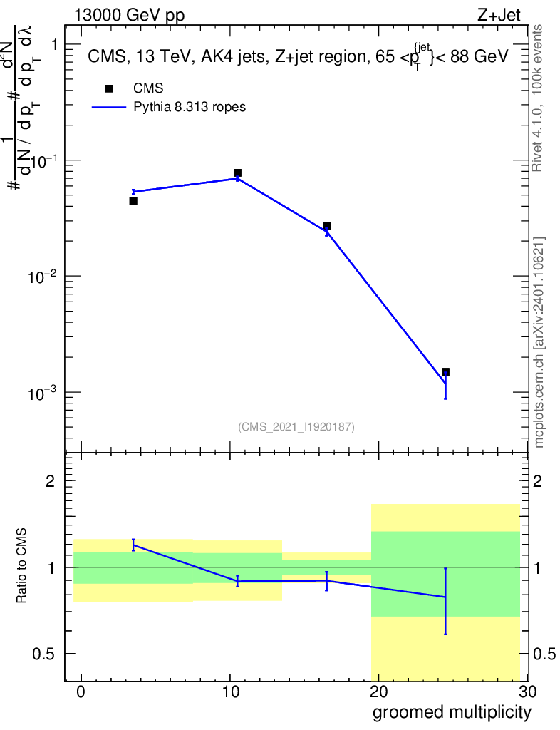 Lines: data, pythia8 8.313 ropes |